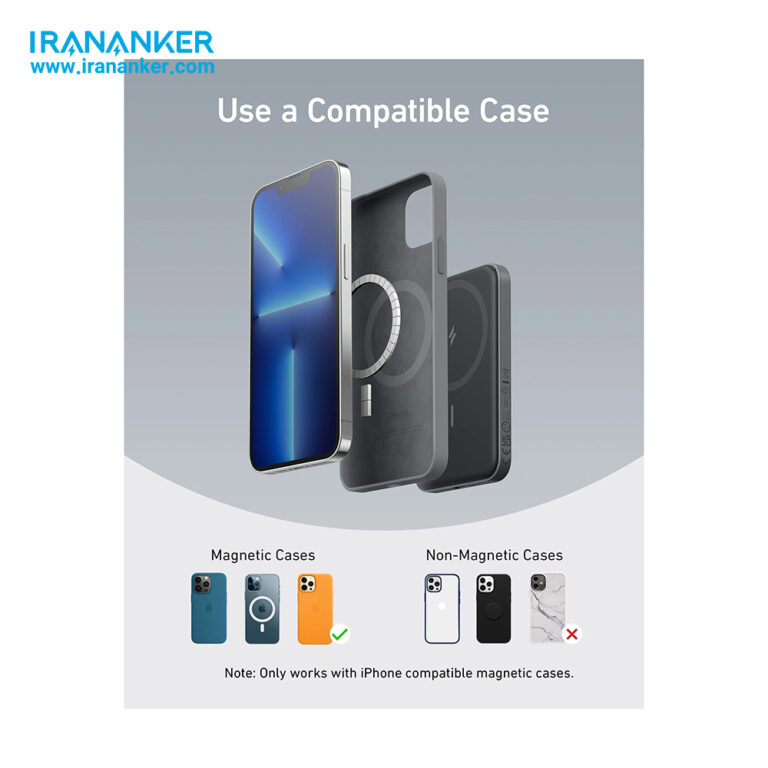 یک باتری لیتیوم پلیمری باظرفیت 5000 میلی آمپرساعتکاربردهای توصیه شده برای محصولات آیفوندارای مگسیف قوی برای ثابت نگه داشتن آیفون در هنگام شارژفناوری جدید MiniCell Anker عملکرد شارژ یکسانمجهز به آهنرباهای فوق العاده قوی که محکم به پشت آیفون سری 12 تا 14 متصل می شوند تا بتوانید به تنهایی سلفی بگیریدپاوربانک انکر مخصوص استفادهی آیفون ۱۳/۱۴، آیفون ۱۳/۱۴پرو، ۱۳/۱۴پرومکس، ۱۲، ۱۲پرو و ۱۲پرومکس